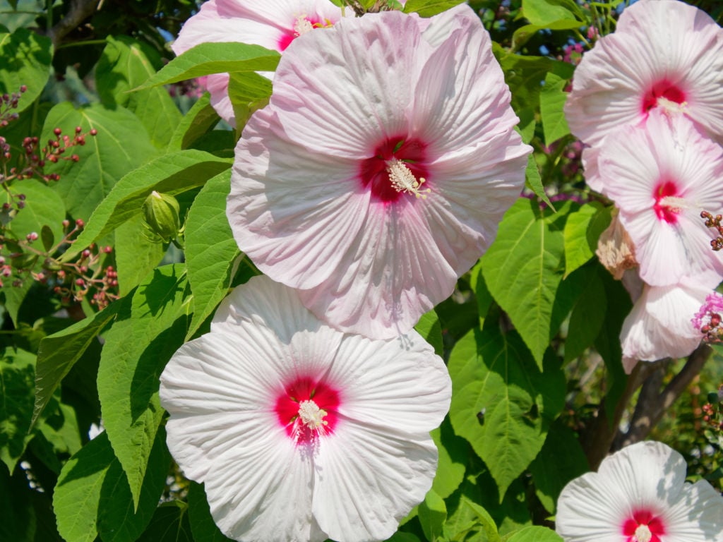 アメリカフヨウは一日花なので、毎日お花が咲いていますが、日によって咲く枝が違っていて、写真のようにいっせいにタイミングが合うのは珍しいです。左に1つ、つぼみが写っていますが、これも同時に咲いてくれたら最高でした。