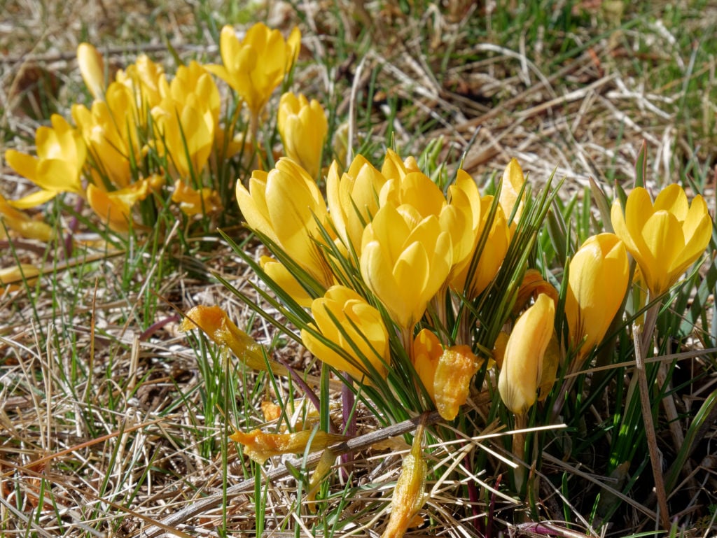 写真は黄色のクロッカスで、おそらくクリサンサス種の品種と思います。かたまって咲いて揃いもいいので、春先のガーデンにはうってつけです。株の外側にしおれた状態のお花があるのが分かるでしょうか。