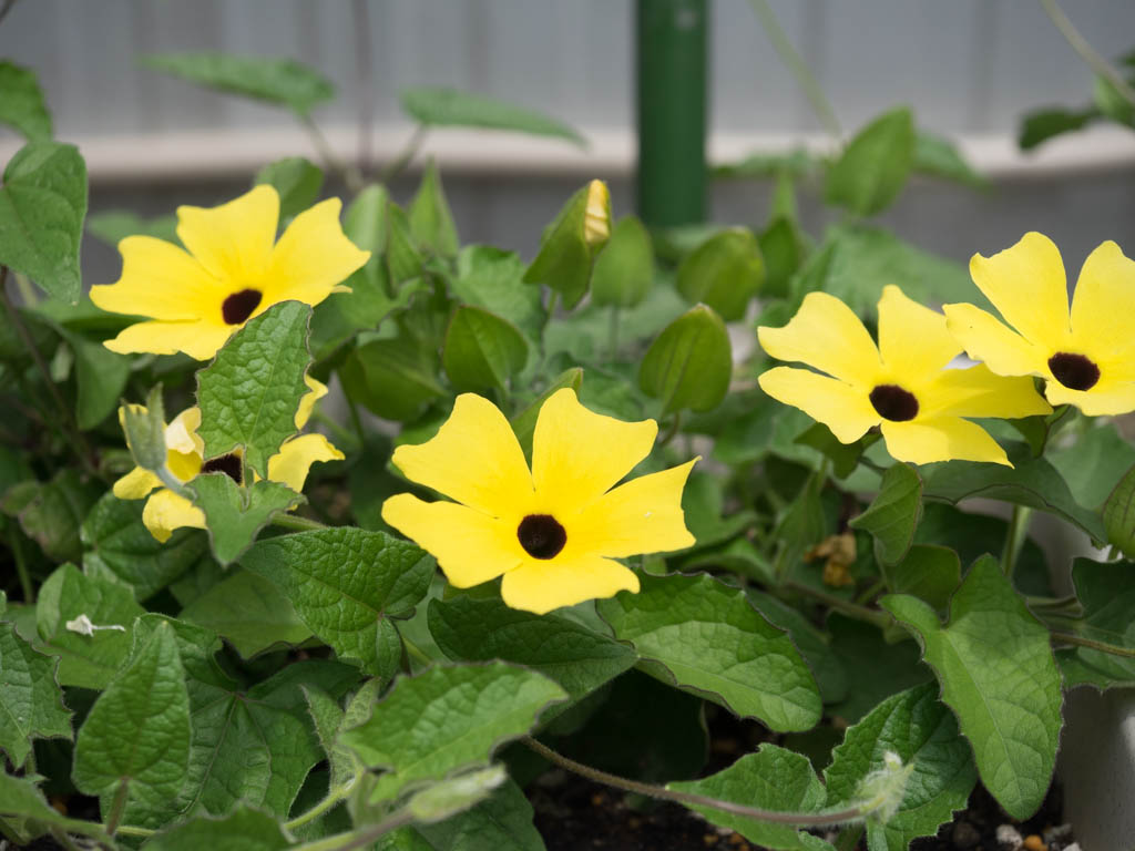 ツンベルギアにはいろいろな種類があって、お花の色もオレンジや赤、青や白など多彩に楽しめます。