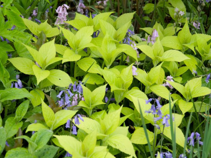 純日本産のシソ科の宿根草、テンニンソウの黄金葉品種です。海外ではこの名前で紹介されて販売されています。写真のように青やピンクのお花と一緒だと、とても映えるカラーリーフだと思います。