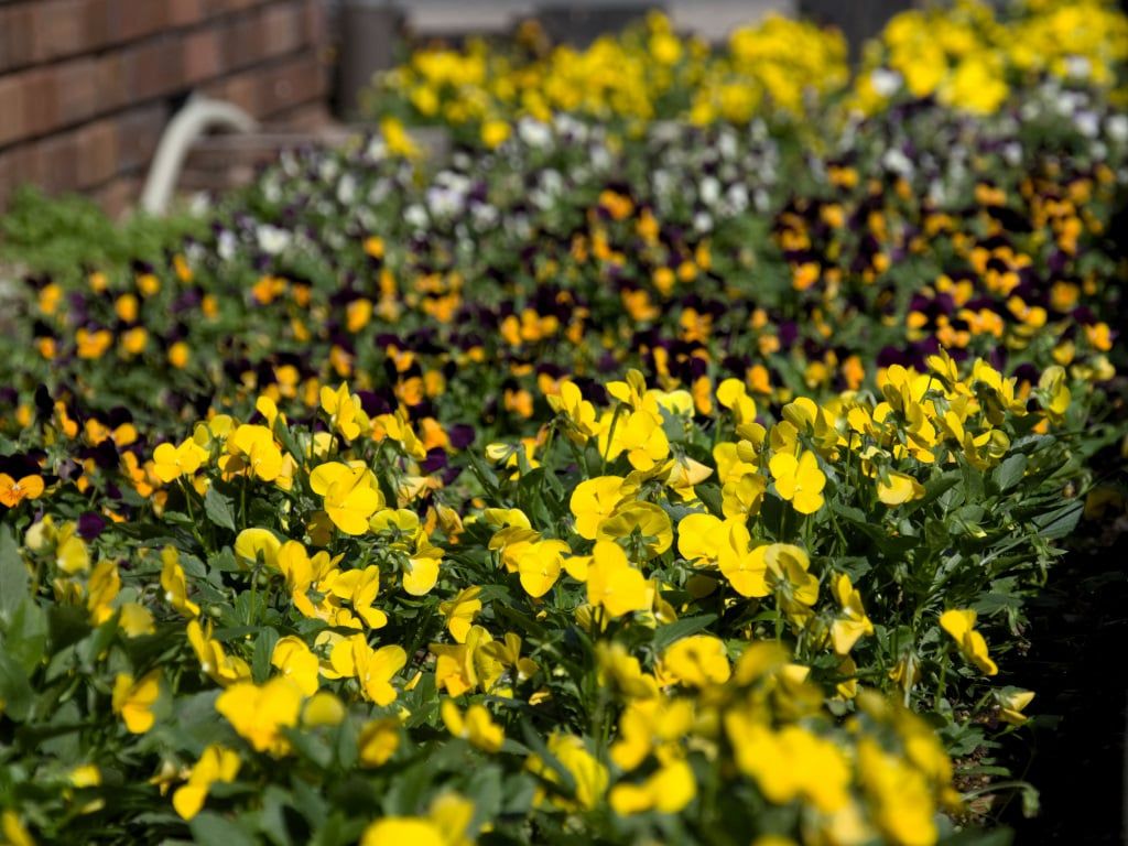 エム・アンド・ビー・フローラの事務所前花壇は、ビオラがきれいに咲きそろっています。どれも F1品種の「ソルベXP」シリーズで、早咲きで分枝がよく、コンパクトな割にお花がたくさん付きます。