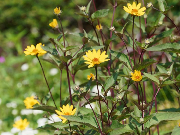 夏に咲くキク科の宿根草の多くは、黄色のお花を咲かせます。たいていは緑色の茎に緑の葉なので、サマーナイトのチョコレート色は良いアクセントになります。成長が早くよく伸びるので、梅雨時期の一番花は切り花として楽しむのもよいと思います。お盆過ぎには返り咲いたお花が楽しめるので、切ってお部屋に飾ってはどうでしょうか。