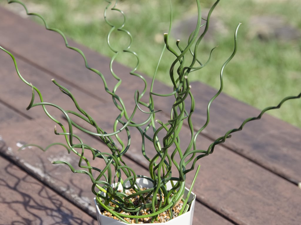 実は、クルクルの細長い葉のように見える緑の部分、これは葉ではありません。意外に思われるかもしれませんがこれは花茎で、お花が咲く茎だけが地面から伸びてこんな姿になっています。本来の葉は根元に小さく鞘状に付いていてほとんど目立ちません。