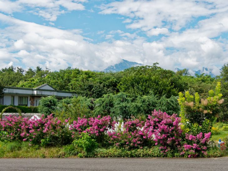 ペレニアルガーデン周辺には、生垣としてサルスベリ、ミナズキ、アナベル、スモークツリーなどの花木があります。アナベルはすっかり咲き進んで、緑の老け花になっています。
