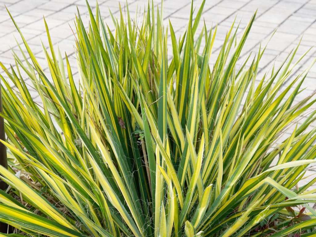 きれいな中斑のイトラン、「ガーランドゴールド」が立派な大株に育ちました。2016年に紹介したときは、花が咲く前の一本立ちの株でしたが、二年後に開花して、たくさんの脇芽が成長しました。