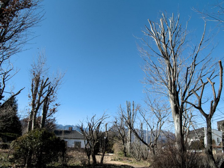 昨年末に伸びすぎた花木を中心に剪定を行いました。けっこうバッサリいった樹が多くて、サクラやリョウブ、ノリウツギなどはかなり背も低く、シンプルな枝ぶりになっています。写真の右端はモクレンの大木と八重桜ですが、細い枝を間引くことでスッキリした姿になりました。