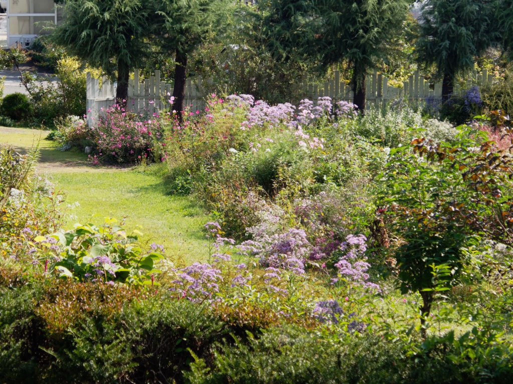 シオンの青紫、コスモスやシュウメイギクの濃いピンク、クジャクソウの白やピンクがあちこちに写っています。ソリダゴやヒメヒマワリ、フロックスはわずかに咲き残りが見られるくらいです。ヘレニウムやダリアなどまだ咲いているお花もある反面、宿根マリーゴールドやサルビアは例年より開花が遅れています。