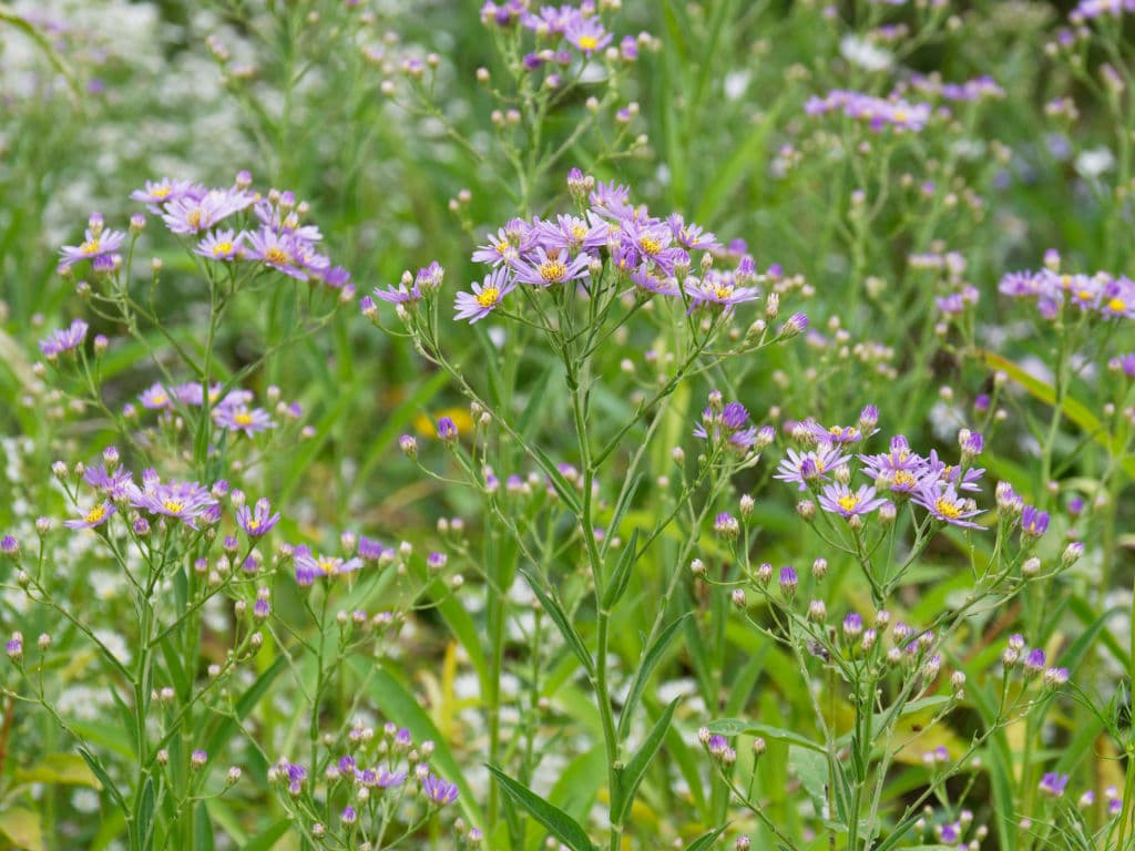 園芸種にダルマシオンという背が伸びにくい系統がありますが、在来種のシオンでも梅雨前に切り戻すことで背丈を低く抑えられます。ペレニアルガーデンでも大きくなりすぎないように切り戻しています。