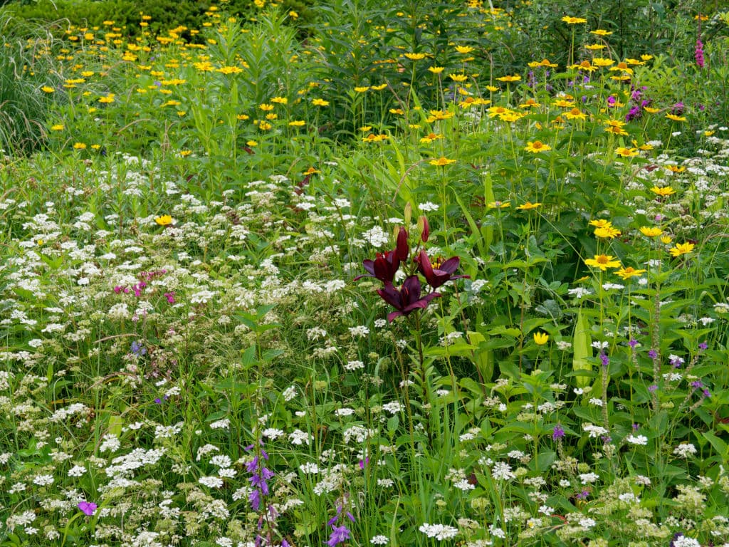 GWの頃から咲き始める、白いお花のオルラヤレースフラワーは、だいぶ咲き進んでタネが目立っています。エゾミソハギや姫ヒマワリ(ヘリオプシス)があちこちで原色の派手なお花を咲かせる中で、スカシユリのナイトライダーが異彩を放っています。