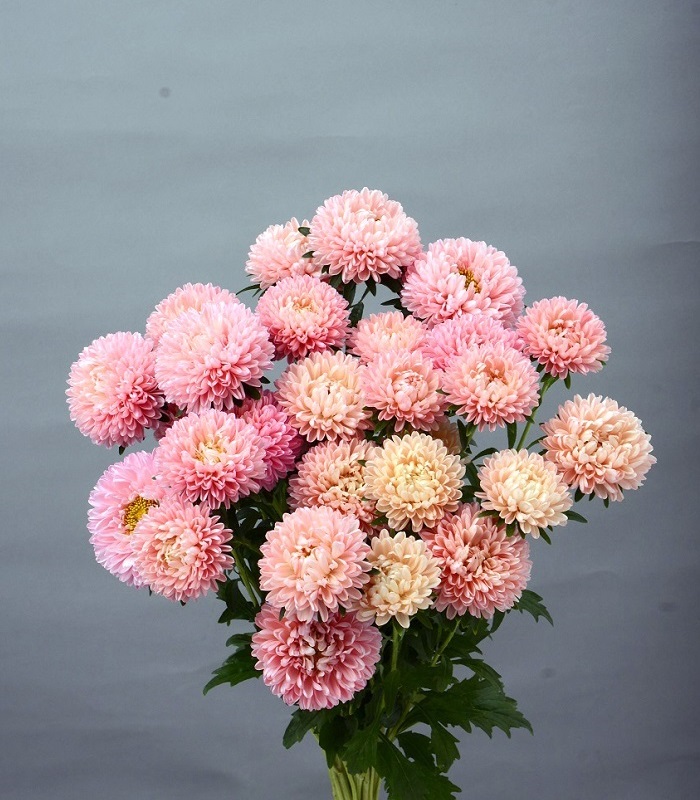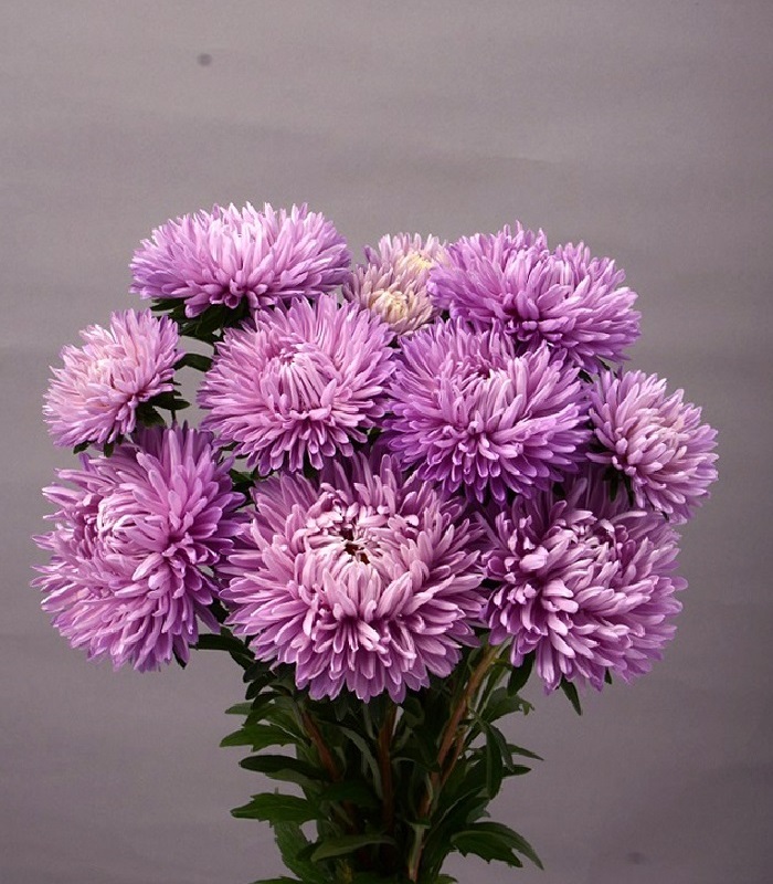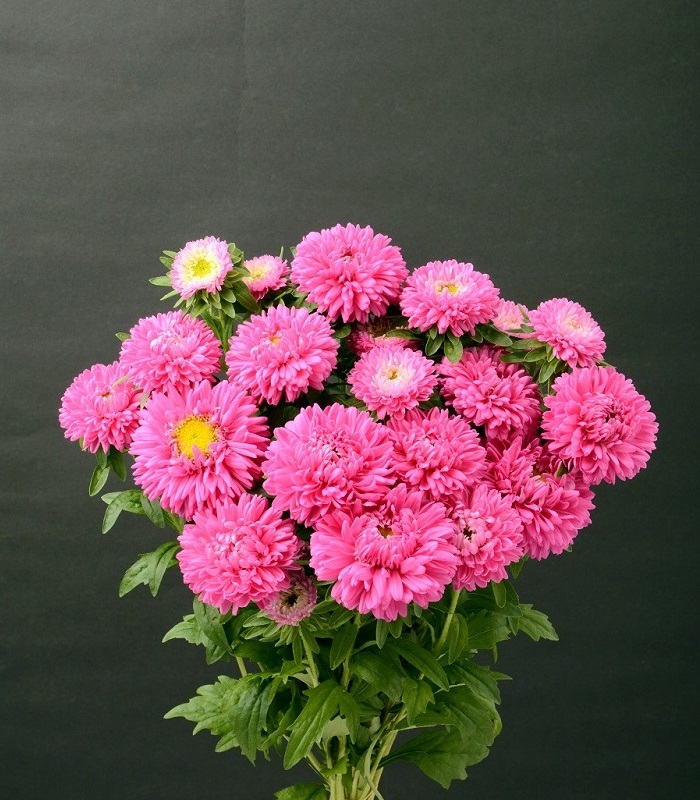 アスター『マッシュシリーズ』 アスターに新品種として『マッシュシリーズ』が追加されました。 花径5~7cm程。花弁枚数が多く、ころころとした可愛い花型が特徴です。 草丈は60~70cmとやや低めですが、分枝が多く1本のボリューム感があります。 ハウス栽培専用品種で、電照によって葉焼け・芯焼けを抑えながら栽培します。