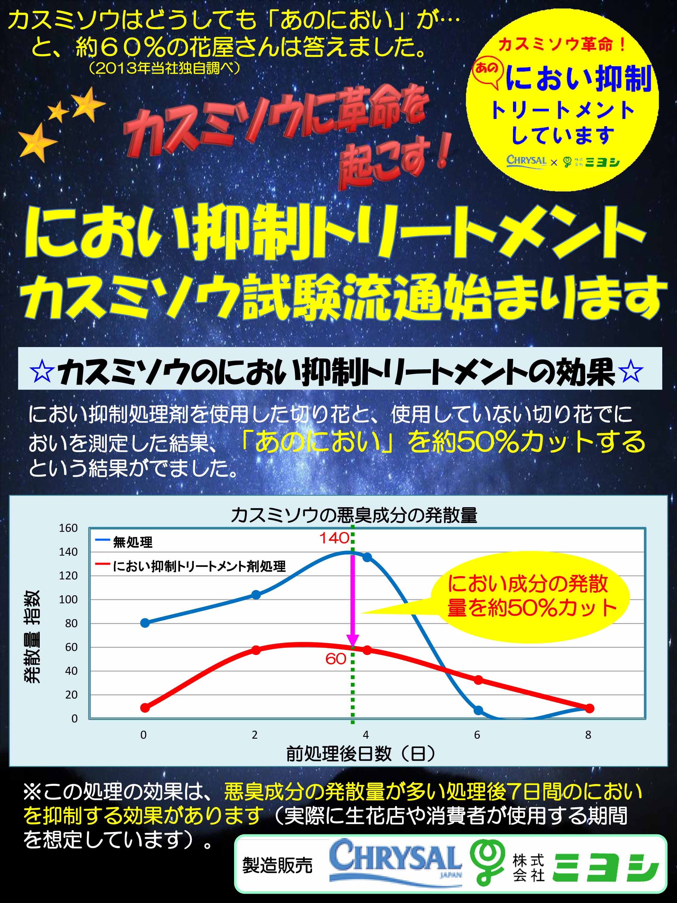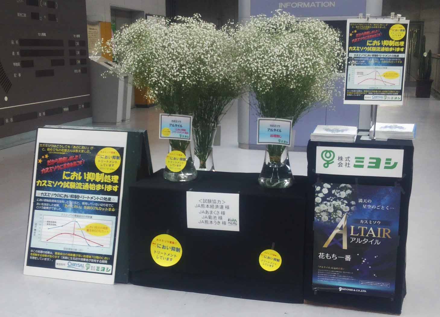 このたび、切り花処理剤メーカーのクリザール・ジャパン株式会社と株式会社ミヨシの共同開発により、「カスミソウのにおい抑制トリートメント剤」の開発に成功いたしました。 カスミソウには独特のにおいがあり、カスミソウを使用するにあたり長年の課題とされておりました。 そのため今回の「カスミソウのにおい抑制トリートメント剤」の開発は、カスミソウの需要拡大に向けた新しい取り組みとして期待されています。 試験的に、におい抑制トリートメント処理を行ったカスミソウの出荷が開始されておりますので、今後の動向にもご注目ください。