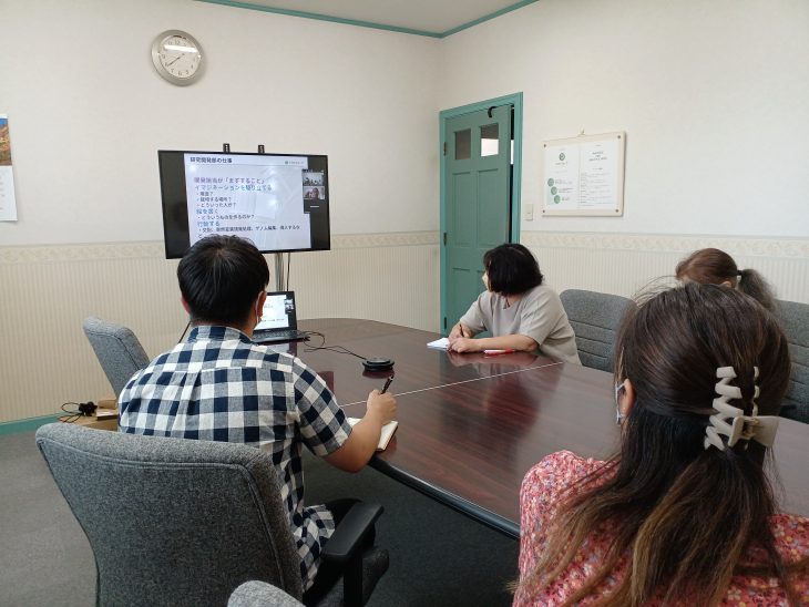 2022年9月上旬にはミヨシ研究開発部 静岡育種農場のオンライン職場説明が、グループ総務部資産情報管理、エム・アンド・ビー・フローラ 東京事務所、ミヨシ国内販売部を対象に行われました。イマジネーションを駆り立て、設計し、行動するという研究開発部の業務説明は普段なかなか聞く機会がなく、とても貴重な時間となりました。話を聞くことで研究開発をより身近に感じ、今後の業務へのモチベーションアップにつながっています。