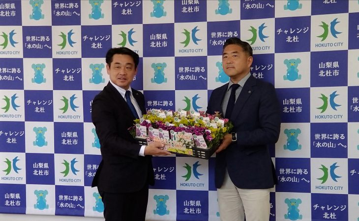 恒例となりました北杜市への花苗寄付のため三好正一社長が上村英司市長を表敬訪問しました。