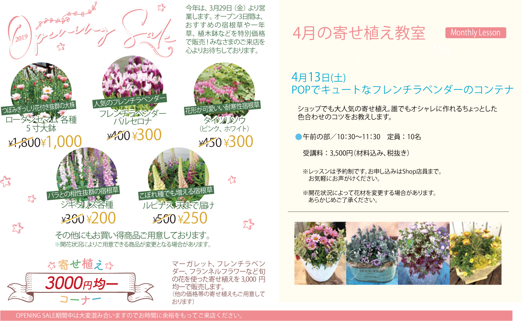 一年草、植木鉢など特別価格で販売します。
