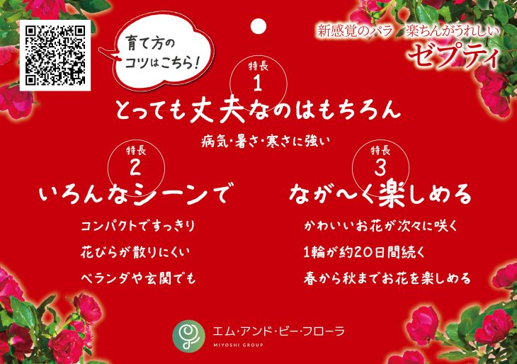 エム・アンド・ビー・フローラが一般消費者向けに販売をしているバラ“ゼプティ”の店舗販促物には、ブランドサイトへリンクするQRコードが記載されています。ポップなどでの直接的な情報がもちろん大事ですが、限られたスペースの中で多くの情報量を伝える手段の一つとして、また場所やタイミングに捉われない情報発信としてもQRコードは有用です。